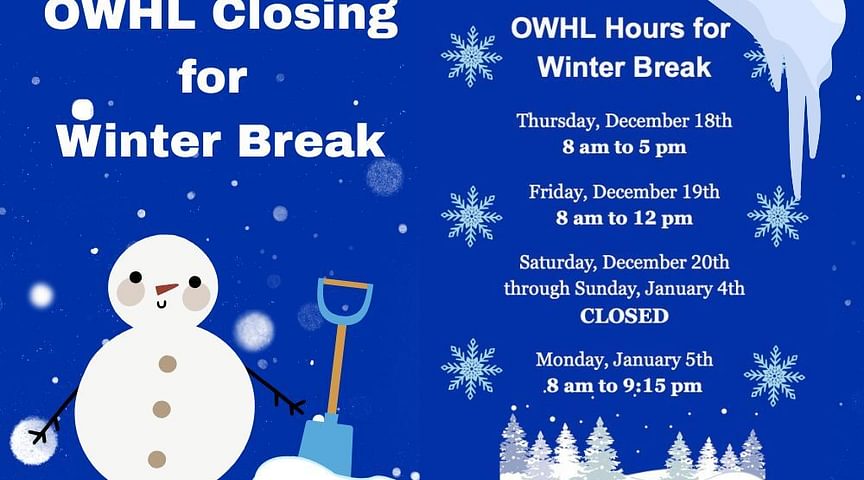 The OWHL will have shortened opening hours before winter break and closed during the break. We will reopen January 5th.